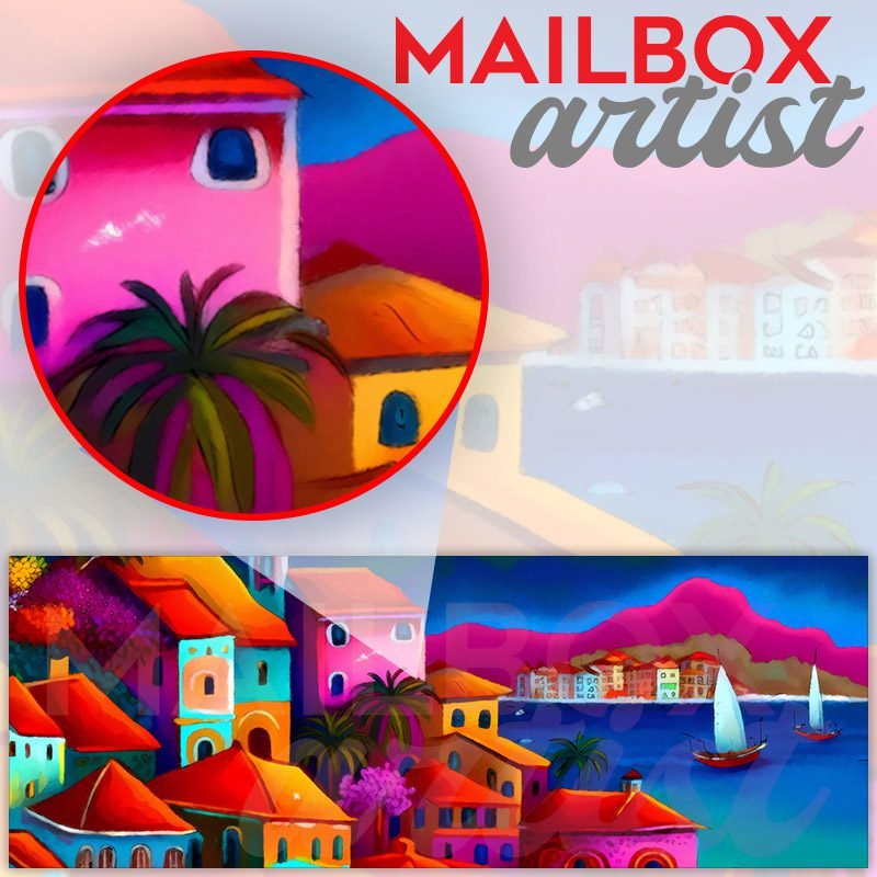 Applying your Colorful Seaside Village townhouse / ranch mailbox cover it’s pretty easy to convert your mailbox to a special and unique item. These covers require a flat surface, so they work with townhouse / ranch mailboxes that do not have any embossed decoration or signs. Magnetic mailbox covers work with steel boxes, for aluminum and plastic boxes we offer the self-adhesive vinyl covers. In case your mailbox doesn’t work with these covers, you can purchase the preinstalled cover on a brand new mailbox as well. Also, you can create your custom townhouse / ranch mailbox cover using you own pictures, adding your name, street number, etc.