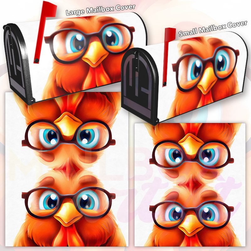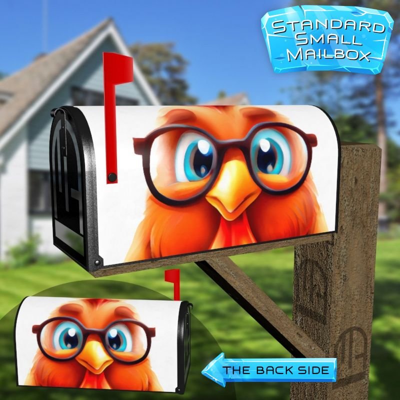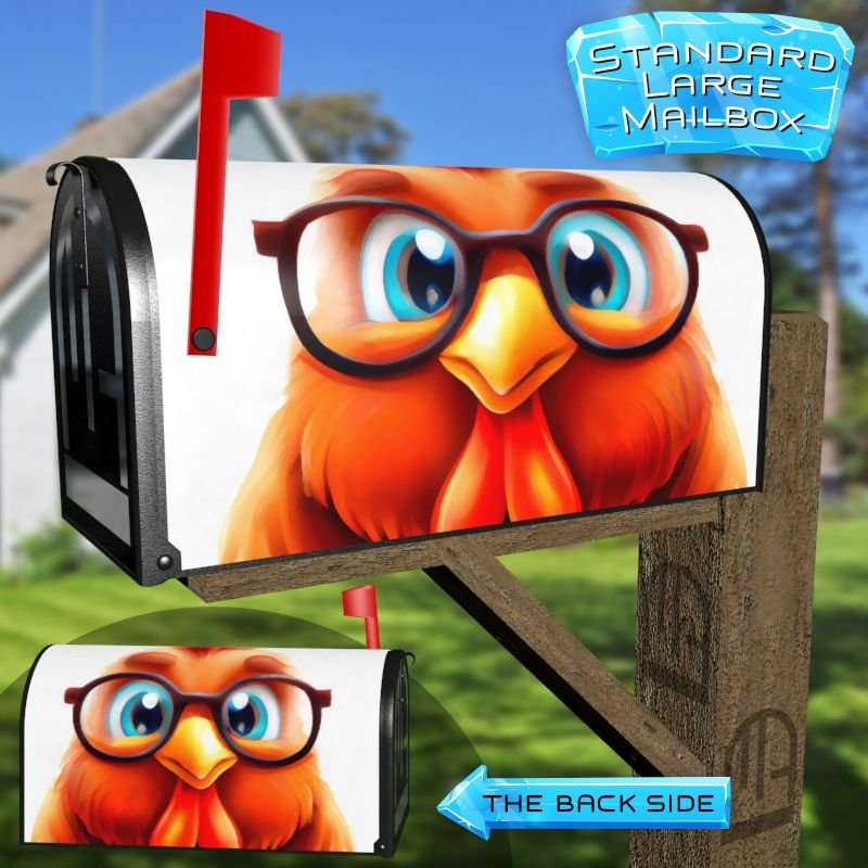 Dressing up your rural farm mailbox with the Cute Rooster with Eyeglasses mailbox cover is an easy way to convert it into a unique and special item. These covers require a smooth surface, so they are compatible with rural farm mailboxes that do not have any embossed decorations or signs. Magnetic mailbox covers work with steel boxes only, while self-adhesive vinyl covers are available for aluminum, plastic and steel boxes. If your mailbox is not compatible with these covers, you can purchase a brand new mailbox with a preinstalled cover. Additionally, you have the option to create a custom rural farm mailbox cover with your own pictures, name, street number, etc.