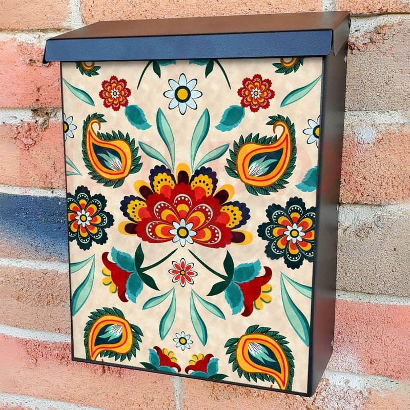 With this European Folk Paisley Design colonial mailbox cover it’s pretty easy to convert your mailbox to a special and unique item. These covers require a flat surface, so they work with colonial mailboxes that do not have any embossed decoration or signs. In case your mailbox doesn’t work with these covers, you can purchase the preinstalled cover on a brand new mailbox as well. Also, you can create your custom colonial mailbox cover using you own pictures, adding your name, street number, etc.