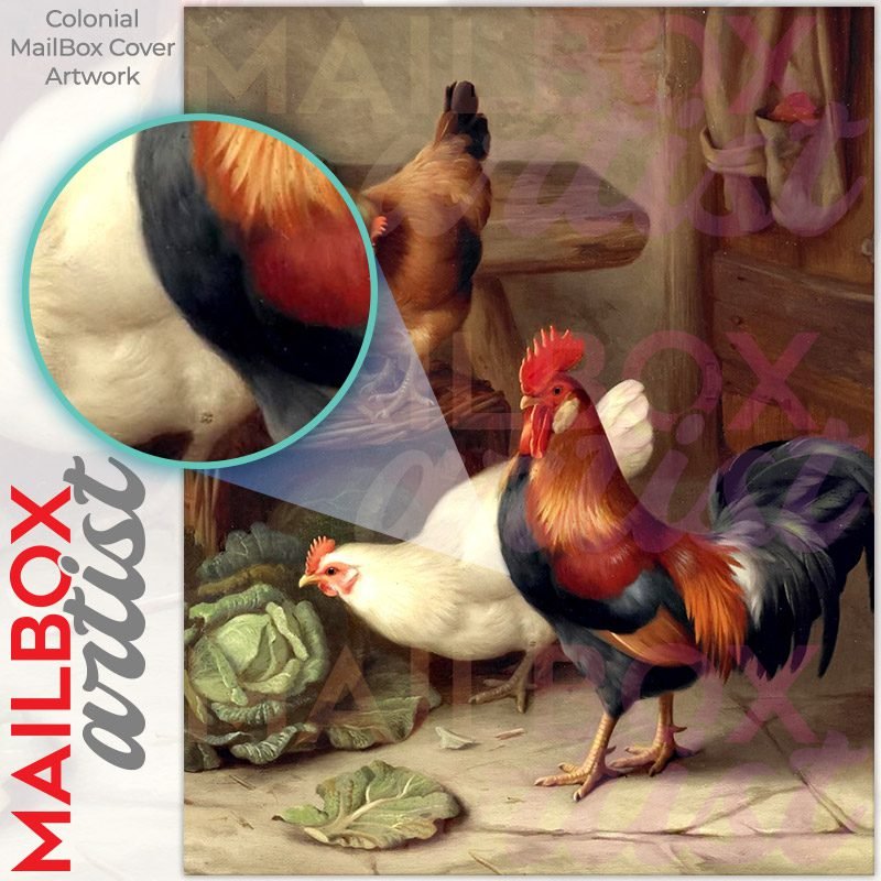 With this Farmhouse Chickens and Rooster colonial mailbox cover it’s pretty easy to convert your mailbox to a special and unique item. These covers require a flat surface, so they work with colonial mailboxes that do not have any embossed decoration or signs. Magnetic mailbox covers work with steel colonial boxes only, while self-adhesive vinyl covers are available for aluminum, plastic and steel boxes. We also offer both self-adhesive and magnetic covers with regular opaque white vinyl or reflective vinyl, which works similarly to license plates or road signs. The reflective option makes the entire cover’s surface reflective, ensuring visibility at night. In case your mailbox doesn’t work with these covers, you can purchase the preinstalled cover on a brand new mailbox as well. Also, you can create your custom colonial mailbox cover using you own pictures, adding your name, street number, etc.