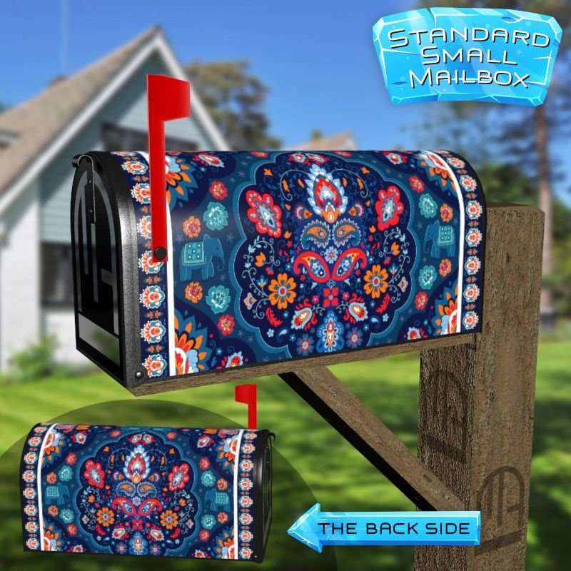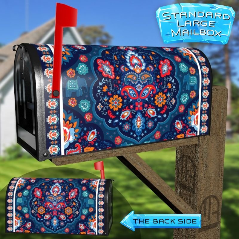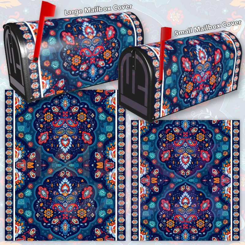 Dressing up your rural farm mailbox with the Indian Paisley Folklore Design #4 mailbox cover is an easy way to convert it into a unique and special item. These covers require a smooth surface, so they are compatible with rural farm mailboxes that do not have any embossed decorations or signs. Magnetic mailbox covers work with steel boxes only, while self-adhesive vinyl covers are available for aluminum, plastic and steel boxes. If your mailbox is not compatible with these covers, you can purchase a brand new mailbox with a preinstalled cover. Additionally, you have the option to create a custom rural farm mailbox cover with your own pictures, name, street number, etc.