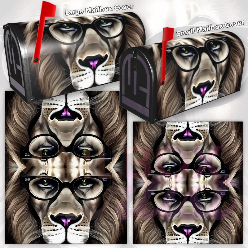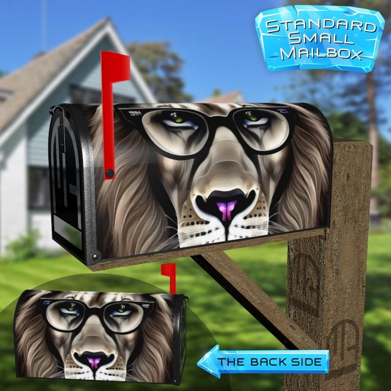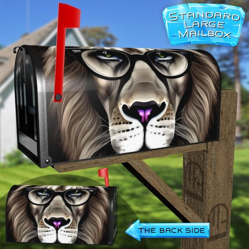 Dressing up your rural farm mailbox with the Lion with Eyeglasses mailbox cover is an easy way to convert it into a unique and special item. These covers require a smooth surface, so they are compatible with rural farm mailboxes that do not have any embossed decorations or signs. Magnetic mailbox covers work with steel boxes only, while self-adhesive vinyl covers are available for aluminum, plastic and steel boxes. If your mailbox is not compatible with these covers, you can purchase a brand new mailbox with a preinstalled cover. Additionally, you have the option to create a custom rural farm mailbox cover with your own pictures, name, street number, etc.