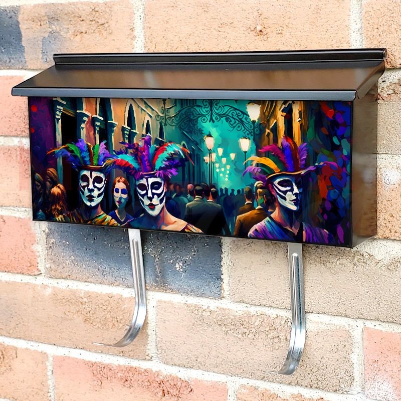 Applying your Mardi Gras Carnival #2 townhouse / ranch mailbox cover it’s pretty easy to convert your mailbox to a special and unique item. These covers require a flat surface, so they work with townhouse / ranch mailboxes that do not have any embossed decoration or signs. Magnetic mailbox covers work with steel boxes, for aluminum and plastic boxes we offer the self-adhesive vinyl covers. In case your mailbox doesn’t work with these covers, you can purchase the preinstalled cover on a brand new mailbox as well. Also, you can create your custom townhouse / ranch mailbox cover using you own pictures, adding your name, street number, etc.