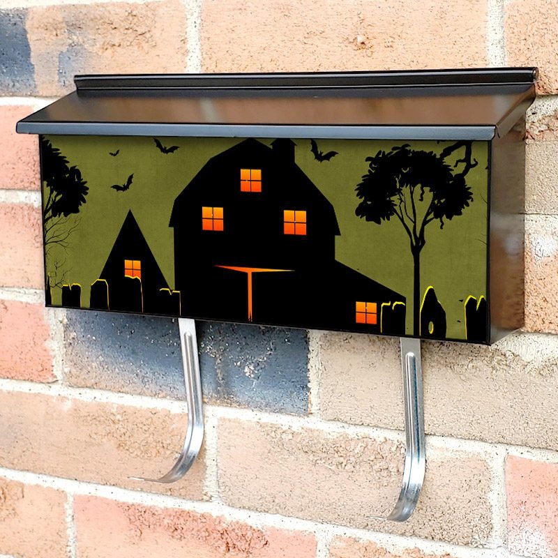 Applying your Sleepy Hollow Halloween Farmhouse townhouse / ranch mailbox cover it’s pretty easy to convert your mailbox to a special and unique item. These covers require a flat surface, so they work with townhouse / ranch mailboxes that do not have any embossed decoration or signs. Magnetic mailbox covers work with steel boxes, for aluminum and plastic boxes we offer the self-adhesive vinyl covers. In case your mailbox doesn’t work with these covers, you can purchase the preinstalled cover on a brand new mailbox as well. Also, you can create your custom townhouse / ranch mailbox cover using you own pictures, adding your name, street number, etc.