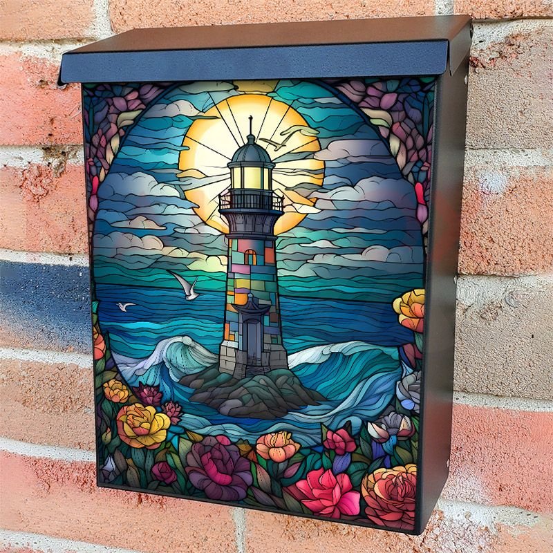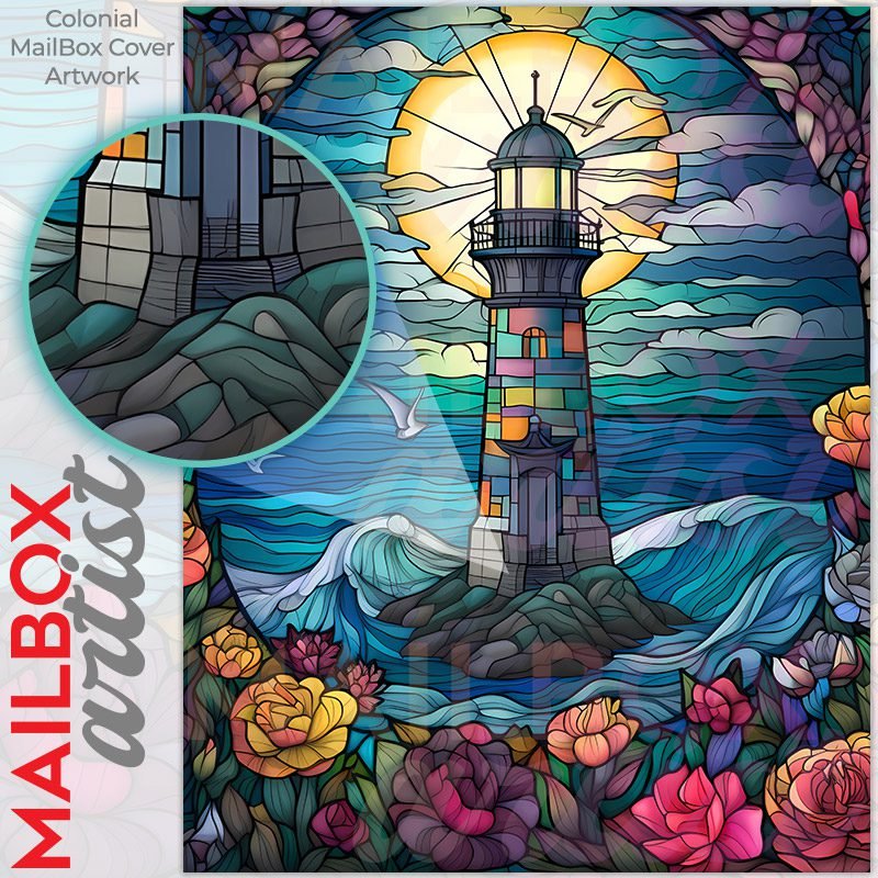 With this Stained Glass Lighthouse Design #2 colonial mailbox cover it’s pretty easy to convert your mailbox to a special and unique item. These covers require a flat surface, so they work with colonial mailboxes that do not have any embossed decoration or signs. Magnetic mailbox covers work with steel colonial boxes only, while self-adhesive vinyl covers are available for aluminum, plastic and steel boxes. We also offer both self-adhesive and magnetic covers with regular opaque white vinyl or reflective vinyl, which works similarly to license plates or road signs. The reflective option makes the entire cover’s surface reflective, ensuring visibility at night. In case your mailbox doesn’t work with these covers, you can purchase the preinstalled cover on a brand new mailbox as well. Also, you can create your custom colonial mailbox cover using you own pictures, adding your name, street number, etc.
