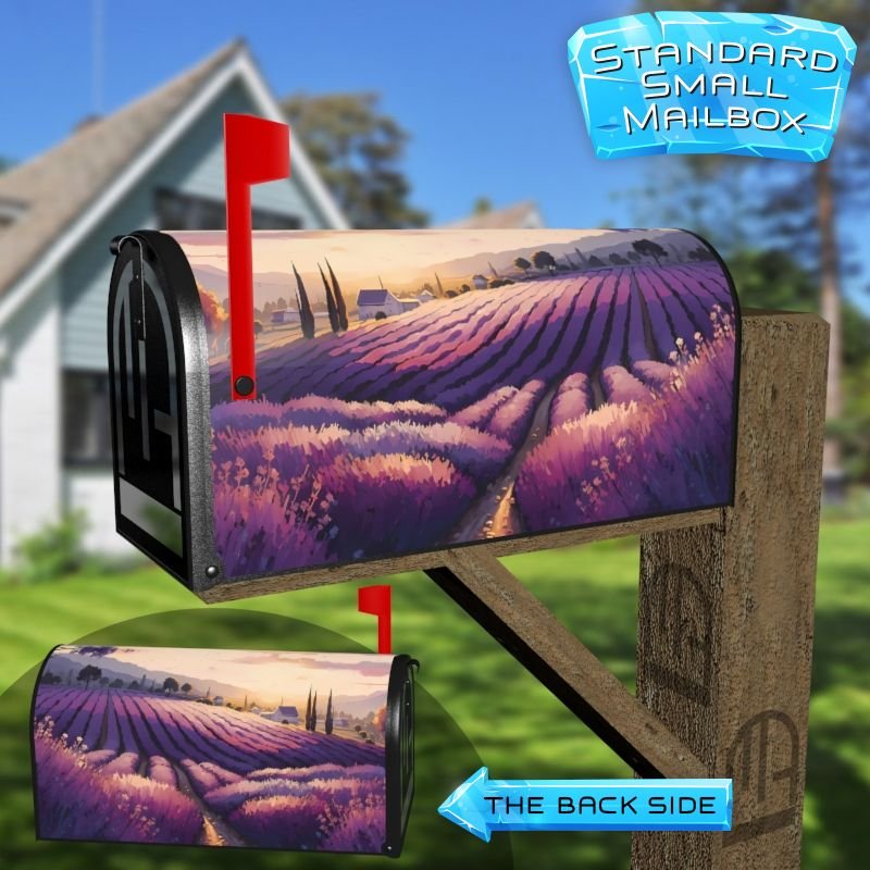 Dressing up your rural farm mailbox with the Summer Lavender Field #4 mailbox cover is an easy way to convert it into a unique and special item. These covers require a smooth surface, so they are compatible with rural farm mailboxes that do not have any embossed decorations or signs. Magnetic mailbox covers work with steel boxes only, while self-adhesive vinyl covers are available for aluminum, plastic and steel boxes. If your mailbox is not compatible with these covers, you can purchase a brand new mailbox with a preinstalled cover. Additionally, you have the option to create a custom rural farm mailbox cover with your own pictures, name, street number, etc.