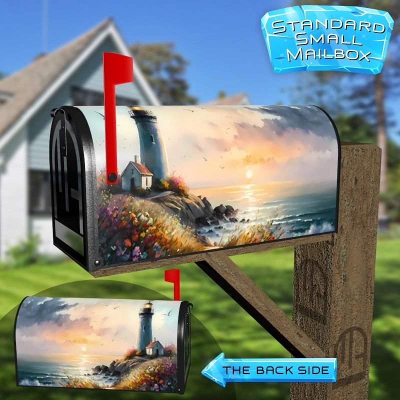 Dressing up your rural farm mailbox with the Summer Lighthouse mailbox cover is an easy way to convert it into a unique and special item. These covers require a smooth surface, so they are compatible with rural farm mailboxes that do not have any embossed decorations or signs. Magnetic mailbox covers work with steel boxes only, while self-adhesive vinyl covers are available for aluminum, plastic and steel boxes. If your mailbox is not compatible with these covers, you can purchase a brand new mailbox with a preinstalled cover. Additionally, you have the option to create a custom rural farm mailbox cover with your own pictures, name, street number, etc.
