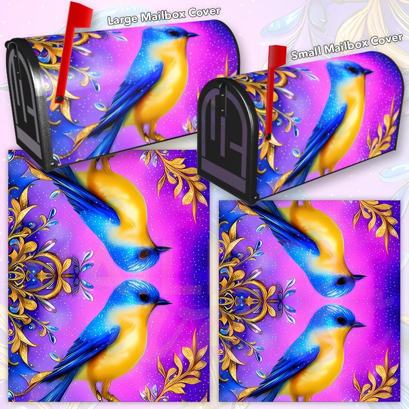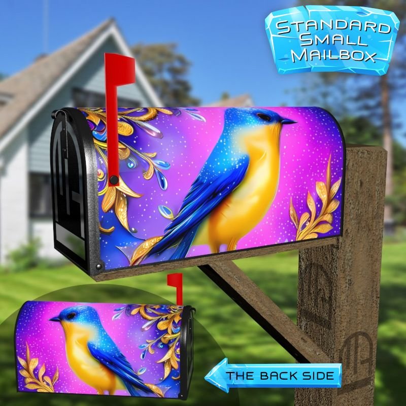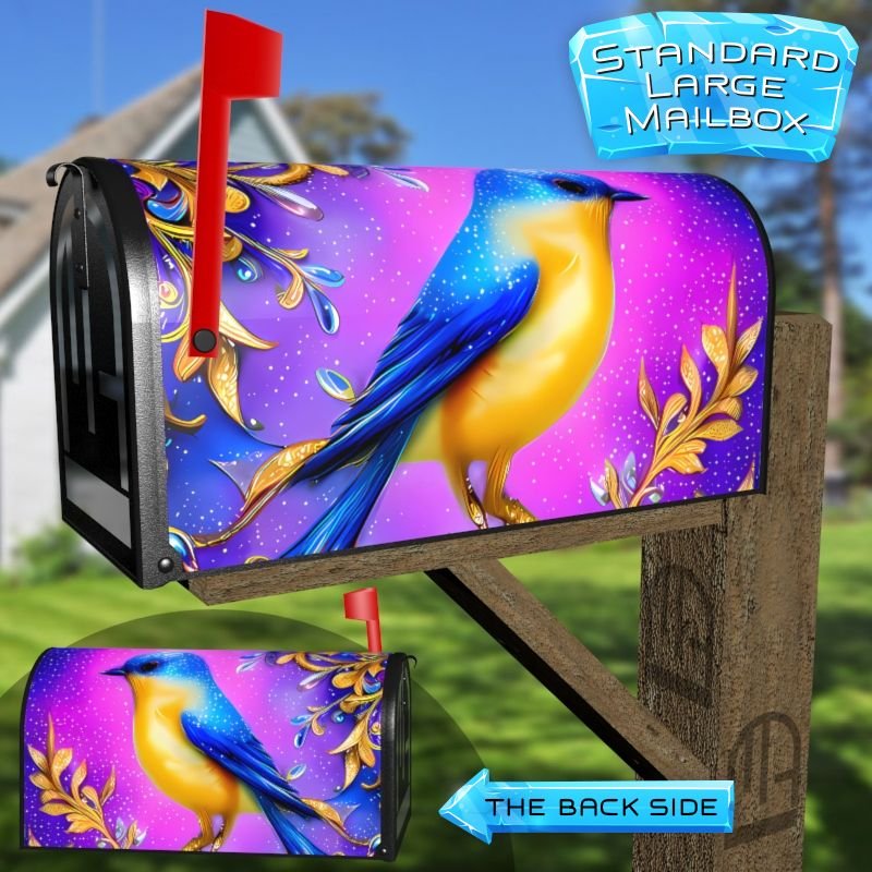 Dressing up your rural farm mailbox with the Whimsical Blue – Yellow Bird mailbox cover is an easy way to convert it into a unique and special item. These covers require a smooth surface, so they are compatible with rural farm mailboxes that do not have any embossed decorations or signs. Magnetic mailbox covers work with steel boxes only, while self-adhesive vinyl covers are available for aluminum, plastic and steel boxes. If your mailbox is not compatible with these covers, you can purchase a brand new mailbox with a preinstalled cover. Additionally, you have the option to create a custom rural farm mailbox cover with your own pictures, name, street number, etc.